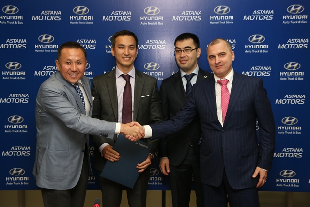 Представители компании «Астана Моторс» Нурлан Смагулов, Шалкар Нуртлеуов и представители компании Hyundai Truck Siberia Захар Гафуров и Александр Гребнев.